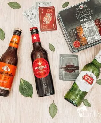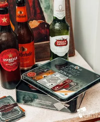 Contenido: Selecciona 3 botellas entre: Estrella Damn (España) Schofferhoffer (Alemania) Belhaven (Escocia) Stella Artois (Belgica) Lata de Juego de Poker Game of Thrones marca Ronda. Gift Me Box Hang Tag