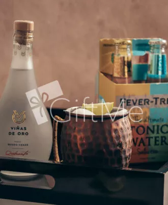 CONTENIDO DEL PACK Pisco Viñas de Oro Mosto Verde Quebranta 500ml (Perú) Four pack agua tónica Fever Tree Multicolor (India) Copper Mug acabado mate Receta Pisco Tonic GiftMe Box